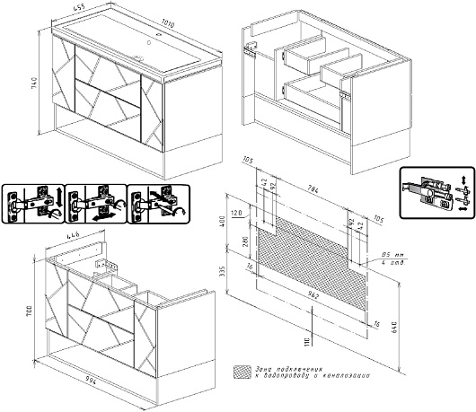 - 2 выдвижных ящика, 2 распашные дверцы.