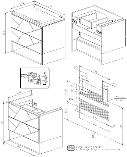 Комплектация: тумба под раковину, раковина, крепления.