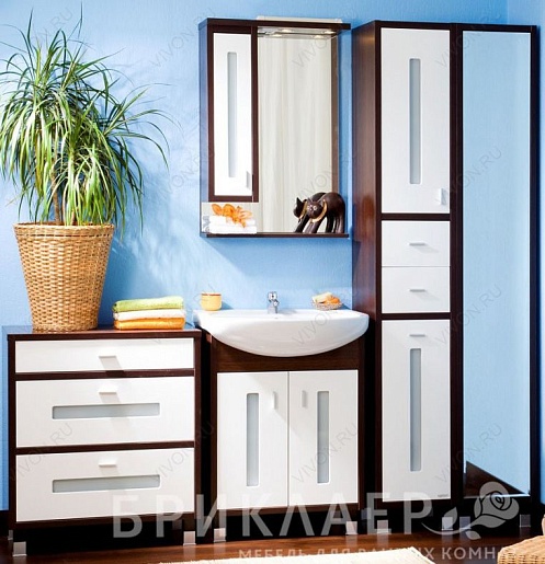 Коллекция мебели Бриклаер Бали в этническом стиле украсит любую ванную комнату. Сочетание венге и белого цвета респектабельно и одновременно спокойно. Кроме красоты эта мебель несет в себе многофункциональность. Украшают фасады распашных дверец витражные вставки матового стекла.