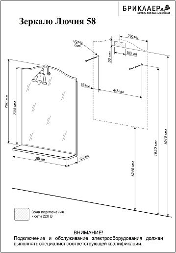 Описание: влагостойкое зеркальное полотно с полкой и светильником.