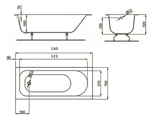 Чугунная ванна Castalia 140x70x42: