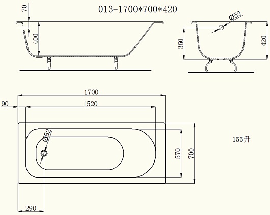 Чугунная ванна Castalia 170x70x42: