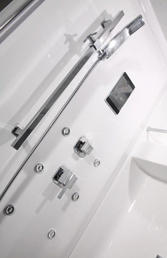 - задняя усиленная акриловая стенка из 2-х частей с 6-ю г/м форсунками, каскадным шейным массажем, смесителем и сенсорным дисплеем