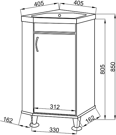 - Размер раковины (ШxГxВ): 405x405x157 мм.