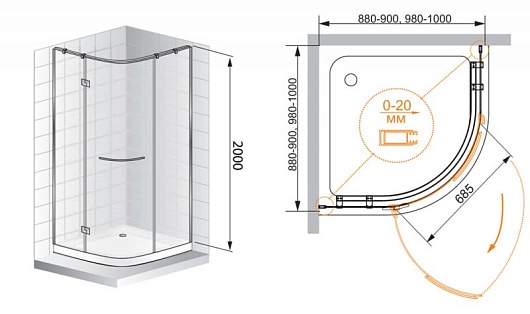 - Регулируемые габариты: (880-900)х(880-900)x2000 мм.
