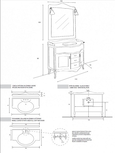 - AN02.01 База под раковину с тремя выдвижными ящиками и двумя распашными дверцами, 106x57x80 см