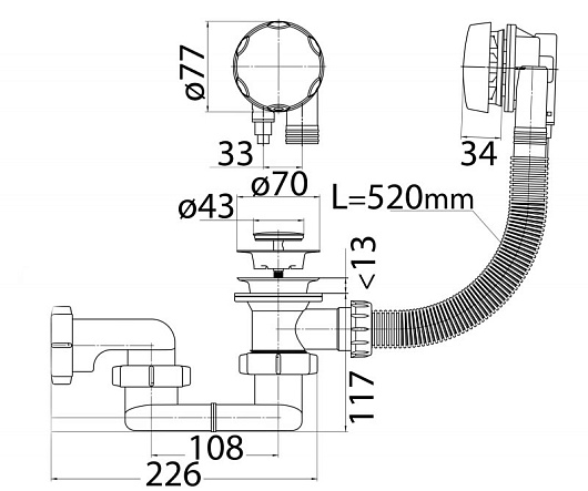 Cezares Слив-перелив полуавтомат для акриловой ванны 520 мм, с гибкой трубой CZR-STP1-01