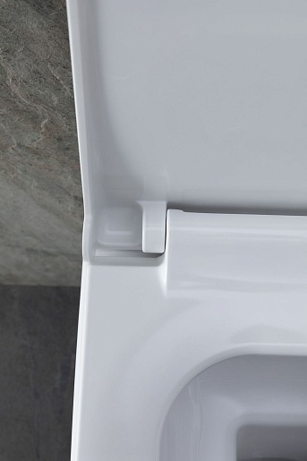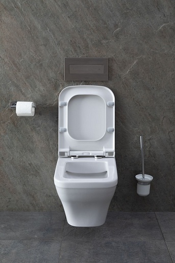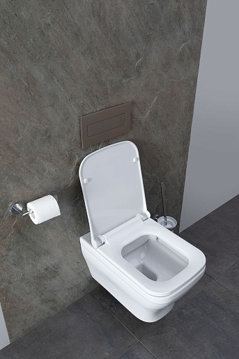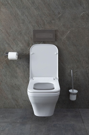 - Механизм сливного бочка монтируется в стену, выполнен в лаконичной прямоугольной форме с кнопкой слива.