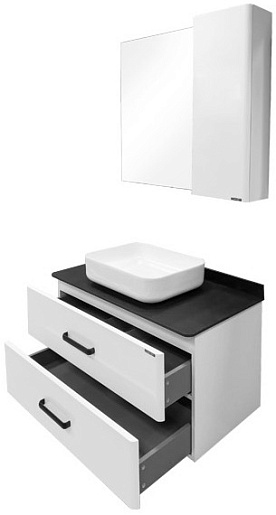 В комплекте: тумба, раковина, столешница, зеркальный шкаф, комплект креплений.