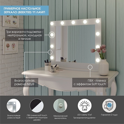 Зеркало гримерное Continent 800x700 белое - арт. ЗГП44.