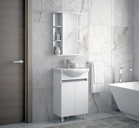 В комплекте: тумба, раковина, зеркальный шкаф, ножка (3 шт.).