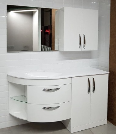 - Тумба под раковину De Aqua Трио Люкс 90 R (Grass) (197202) с двумя выдвижными фасадами и открытыми полками.