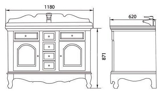 - тумба под раковину Неаполь 120: массив дуба, ящик выдвижной - 6 шт., распашная дверца - 2 шт., ручка - 8 шт.