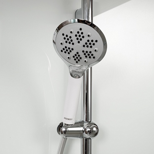 - Душевая штанга с регулировкой лейки по высоте и ручная лейка с силиконовыми форсунками с функцией переключения режимов .