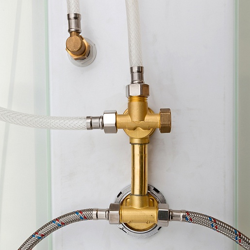 - Латунный смеситель с керамическими картриджами и резьбовыми соединениями.