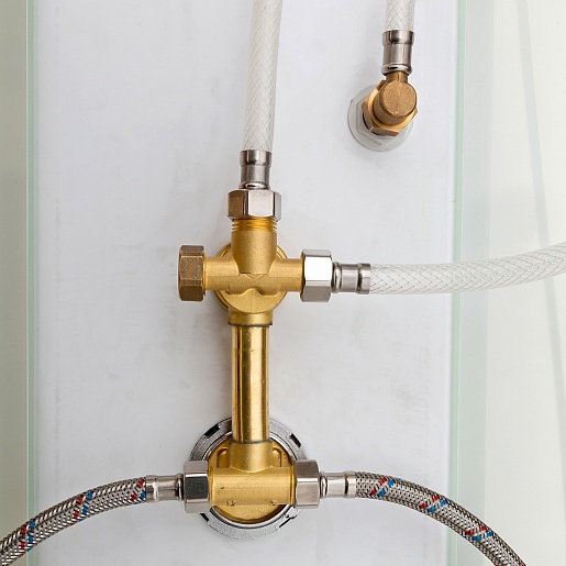 - Латунный смеситель с керамическими картриджами и резьбовыми соединениями.