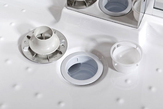 - Усиленный акриловый поддон с дренажными отводами, на металлическом каркасе с регулируемыми по высоте ножками, выдерживающий нагрузку до 320 кг.