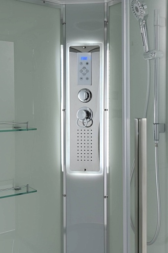- В комплекте: душевая штанга, две полочки, тропический (верхний) душ, арома-лейка с витамином С (картридж съемный), полимерная вставка в поддон(имитация дерева), сифон, ручки дверей из нержавейки, двойные ролики, пульт сенсорный (Блютуз, LED подсветка, радио, вытяжка), гидромассаж спины.