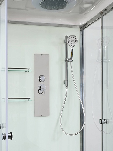 - Душевая штанга(позволяет регулировать по высоте ручную лейку), ручная арома-лейка с витамином С (картридж в комплекте, есть возможность замены или удаления картриджа), полочки(из стекла, с ограничителем), сифон с гидрозатвором.