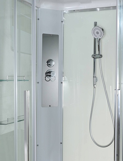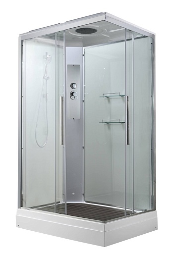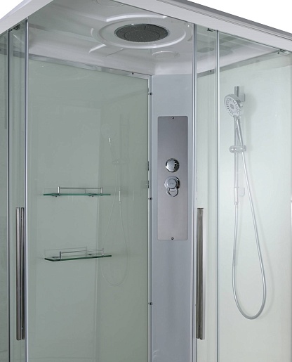 - Душевая штанга(позволяет регулировать по высоте ручную лейку), ручная арома-лейка с витамином С (картридж в комплекте, есть возможность замены или удаления картриджа), полочки(из стекла, с ограничителем), сифон с гидрозатвором.