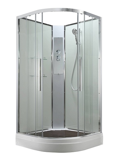 - В комплекте: душевая штанга, две полочки, тропический (верхний) душ, арома-лейка с витамином С (картридж съемный), полимерная вставка в поддон(имитация дерева), сифон, ручки дверей из нержавейки, двойные ролики.