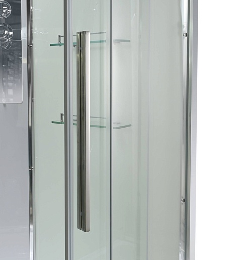 - В комплекте: душевая штанга, две полочки, тропический (верхний) душ, арома-лейка с витамином С (картридж съемный), полимерная вставка в поддон(имитация дерева), сифон, ручки дверей из нержавейки, двойные ролики, пульт сенсорный (Блютуз, LED подсветка, радио, вытяжка), гидромассаж спины.