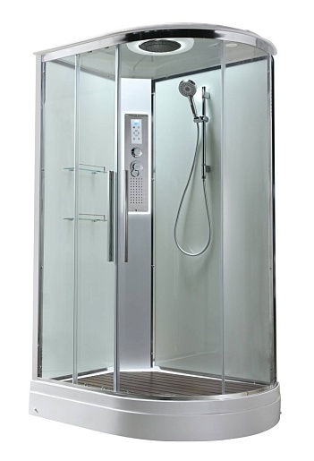 - В комплекте: душевая штанга, две полочки, тропический (верхний) душ, арома-лейка с витамином С (картридж съемный), полимерная вставка в поддон(имитация дерева), сифон, ручки дверей из нержавейки, двойные ролики, пульт сенсорный (Блютуз, LED подсветка, радио, вытяжка), гидромассаж спины.