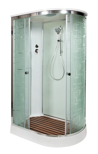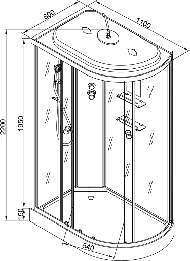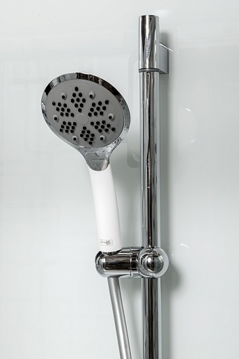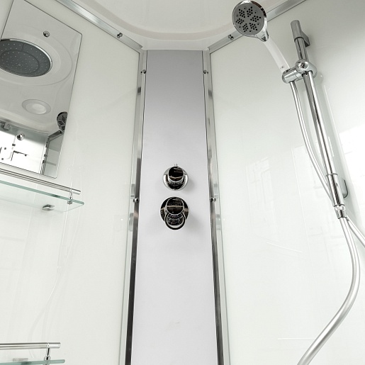 - В комплекте зеркало, переключатель режимов, смеситель, тропический (верхний) душ, полочки, тропический (верхний) душ, вставка в поддон.