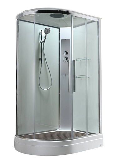 - В комплекте: душевая штанга, две полочки, тропический (верхний) душ, арома-лейка с витамином С (картридж съемный), полимерная вставка в поддон(имитация дерева), сифон, ручки дверей из нержавейки, двойные ролики.