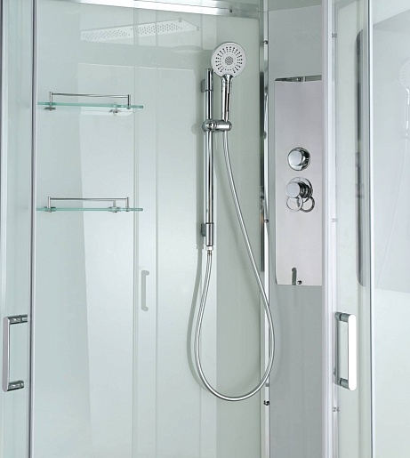 - Душевая штанга(позволяет регулировать по высоте ручную лейку), ручная арома-лейка с витамином С (картридж в комплекте, есть возможность замены или удаления картриджа), полочки(из стекла, с ограничителем), сифон с гидрозатвором.