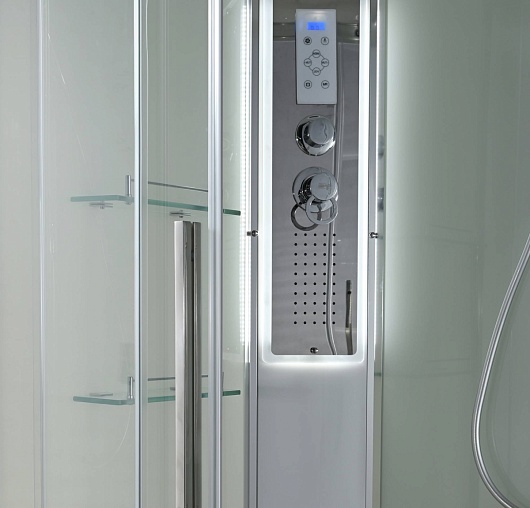 - В комплекте: душевая штанга, две полочки, тропический (верхний) душ, арома-лейка с витамином С (картридж съемный), полимерная вставка в поддон(имитация дерева), сифон, ручки дверей из нержавейки, двойные ролики, пульт сенсорный (Блютуз, LED подсветка, радио, вытяжка), гидромассаж спины.