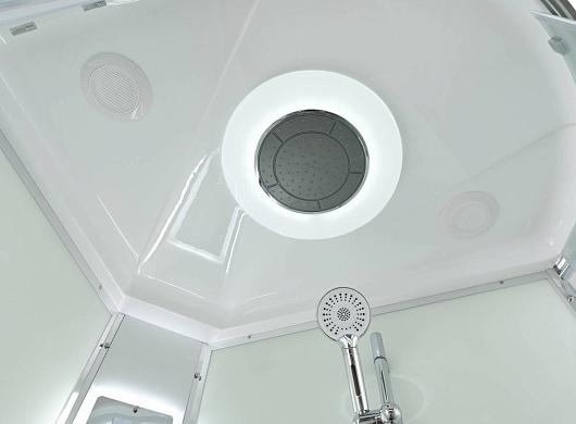 - В комплекте: душевая штанга, две полочки, тропический (верхний) душ, арома-лейка с витамином С (картридж съемный), полимерная вставка в поддон(имитация дерева), сифон, ручки дверей из нержавейки, двойные ролики, пульт сенсорный (Блютуз, LED подсветка, радио, вытяжка), гидромассаж спины.