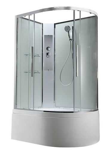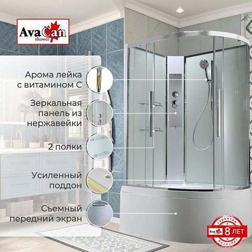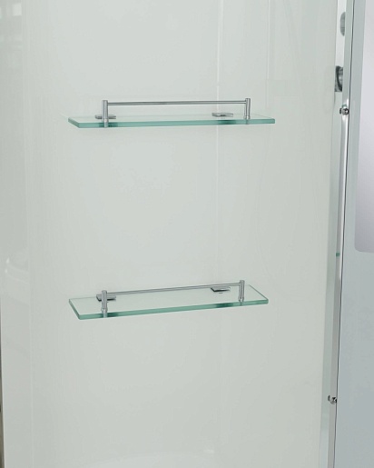 - В комплекте: душевая штанга, две полочки, арома-лейка с витамином С (картридж съемный), полимерная вставка в поддон(имитация дерева), сифон, ручки дверей из нержавейки, двойные ролики.