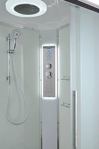 - В комплекте: душевая штанга, две полочки, тропический (верхний) душ, арома-лейка с витамином С (картридж съемный), полимерная вставка в поддон(имитация дерева), сифон, ручки дверей из нержавейки, двойные ролики, пульт сенсорный (Блютуз, LED подсветка, радио, вытяжка), гидромассаж спины.