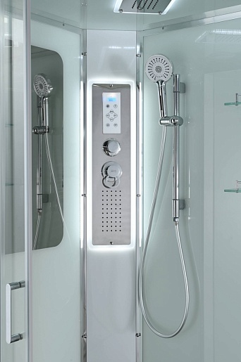 - Душевая штанга(позволяет регулировать по высоте ручную лейку), ручная арома-лейка с витамином С (картридж в комплекте, есть возможность замены или удаления картриджа), полочки(из стекла, с ограничителем), сифон с гидрозатвором.