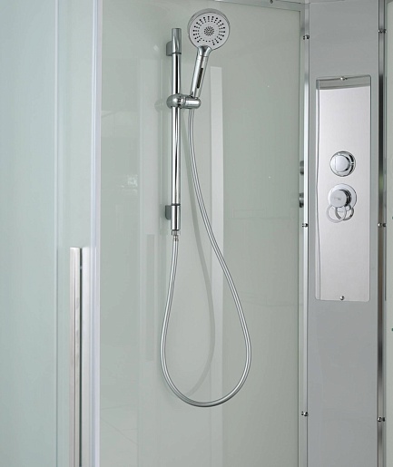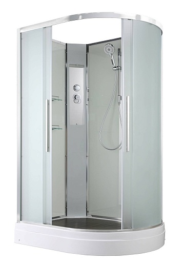 - В комплекте: душевая штанга, две полочки, арома-лейка с витамином С (картридж съемный), полимерная вставка в поддон(имитация дерева), сифон, ручки дверей из нержавейки, двойные ролики.