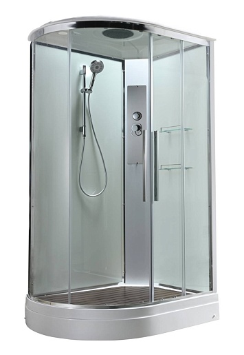 - В комплекте: душевая штанга, две полочки, тропический (верхний) душ, арома-лейка с витамином С (картридж съемный), полимерная вставка в поддон(имитация дерева), сифон, ручки дверей из нержавейки, двойные ролики.