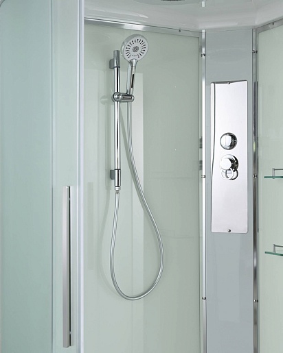 - В комплекте: душевая штанга, две полочки, тропический (верхний) душ, арома-лейка с витамином С (картридж съемный), полимерная вставка в поддон(имитация дерева), сифон, ручки дверей из нержавейки, двойные ролики.