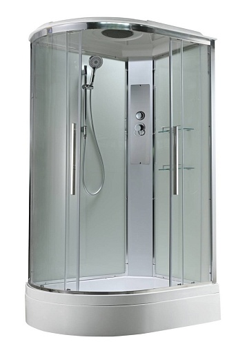 - В комплекте: душевая штанга, две полочки, тропический (верхний) душ, арома-лейка с витамином С (картридж съемный), полимерная вставка в поддон(имитация дерева), сифон, ручки дверей из нержавейки, двойные ролики.
