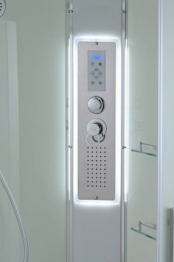 - В комплекте: душевая штанга, две полочки, тропический (верхний) душ, арома-лейка с витамином С (картридж съемный), полимерная вставка в поддон(имитация дерева), сифон, ручки дверей из нержавейки, двойные ролики, пульт сенсорный (Блютуз, LED подсветка, радио, вытяжка), гидромассаж спины.