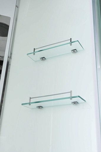 - В комплекте: душевая штанга, две полочки, арома-лейка с витамином С (картридж съемный), полимерная вставка в поддон(имитация дерева), сифон, ручки дверей из нержавейки, двойные ролики.
