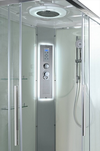 - Душевая штанга(позволяет регулировать по высоте ручную лейку), ручная арома-лейка с витамином С (картридж в комплекте, есть возможность замены или удаления картриджа), полочки(из стекла, с ограничителем), сифон с гидрозатвором, сенсорный пульт управления с функциями: блютуз, LED подсветка, радио, вытяжка, гидромассаж спины, тропический (верхний) душ.