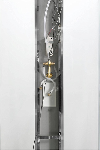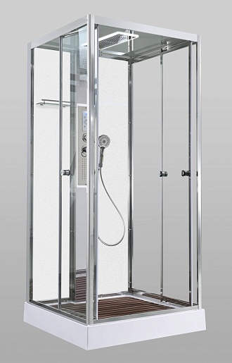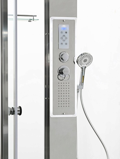 - Душевая штанга(позволяет регулировать по высоте ручную лейку), ручная арома-лейка с витамином С (картридж в комплекте, есть возможность замены или удаления картриджа), полочки(из стекла, с ограничителем), сифон с гидрозатвором, сенсорный пульт управления с функциями: блютуз, LED подсветка, радио, вытяжка, гидромассаж спины, тропический (верхний) душ.