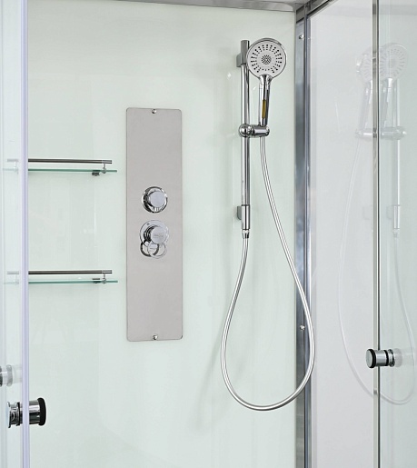 - Душевая штанга(позволяет регулировать по высоте ручную лейку), ручная арома-лейка с витамином С (картридж в комплекте, есть возможность замены или удаления картриджа), полочки(из стекла, с ограничителем), сифон с гидрозатвором.