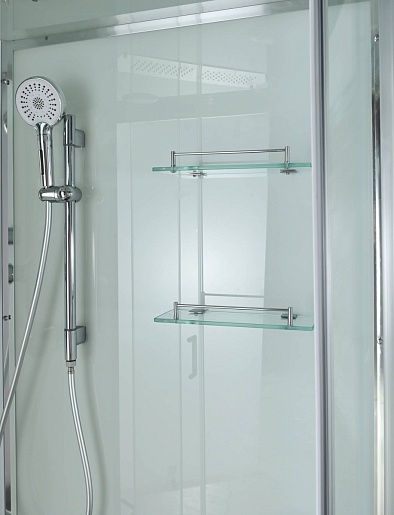 - Душевая штанга(позволяет регулировать по высоте ручную лейку), ручная арома-лейка с витамином С (картридж в комплекте, есть возможность замены или удаления картриджа), полочки(из стекла, с ограничителем), сифон с гидрозатвором.