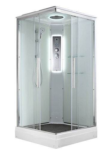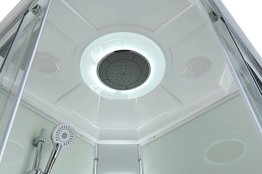 - Душевая штанга(позволяет регулировать по высоте ручную лейку), ручная арома-лейка с витамином С (картридж в комплекте, есть возможность замены или удаления картриджа), полочки(из стекла, с ограничителем), сифон с гидрозатвором, сенсорный пульт управления с функциями: блютуз, LED подсветка, радио, вытяжка, гидромассаж спины, тропический (верхний) душ.
