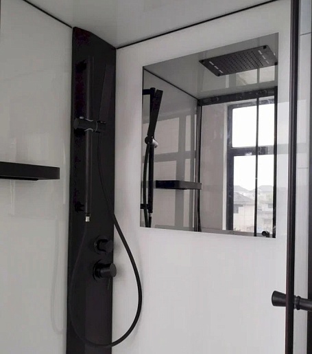 - Функциональная панель из ПВХ. Рычажные переключатели режимов и смеситель. Стойка держателя лейки, ручная лейка и шланг из ПВХ (длина – 1,5 м). Полочка для шампуня (ПВХ).