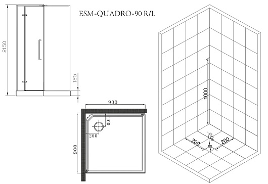 Esbano Душевая кабина ESM-QUADRO-90 (Right) 90x90 профиль чёрный