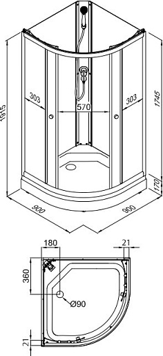 В комплекте: сифон, душевой набор с лейкой на гибком шланге, поддон.
