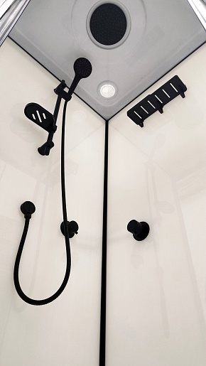 В комплекте: сифон, душевой набор с лейкой на гибком шланге и верхним душем, полочка с крючками, поддон с бортиком.